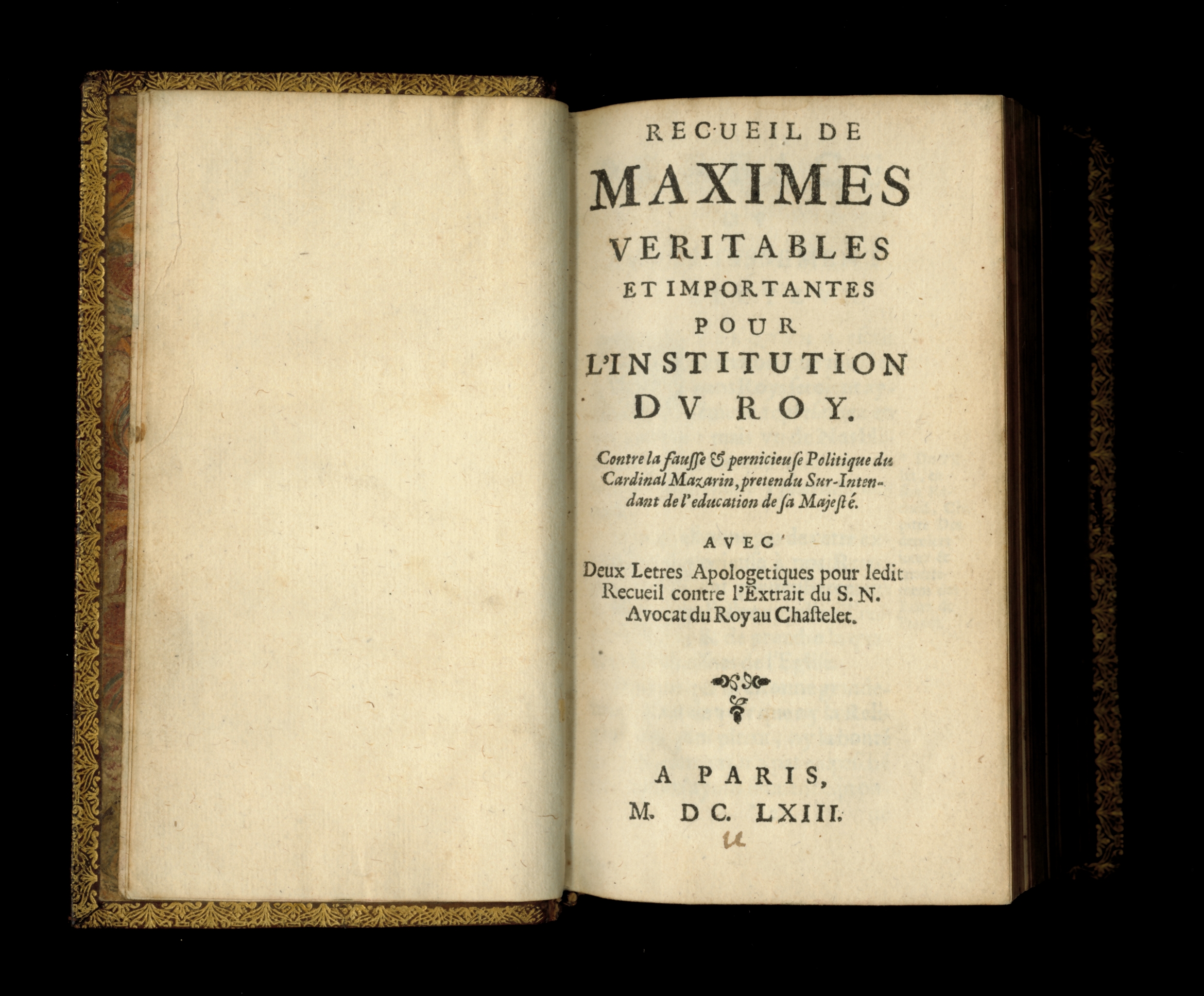 Recueil de Maximes véritables et importantes pour l'institution du Roy. Contre la fausse et pernicieuse politique du Cardinal Mazarin, prétendu Sur-Intendant de l'éducation de sa Majesté. Avec deux Lettres Apologétiques pour ledit Recueil contre l'Extrait du S. N. Avocat du Roy au Chastelet.